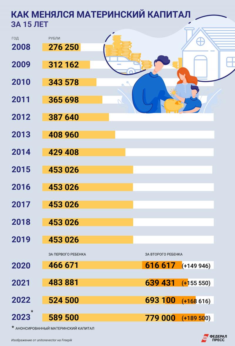 В 2023 году, как анонсировал Владимир Путин, размер выплаты на первого ребенка планируется увеличить почти до 590 тысяч рублей, а на второго — до 780 тысяч рублей. При этом, если на первого ребенка сертификат уже был использован, родители могут получить на второго 189 500 рублей.