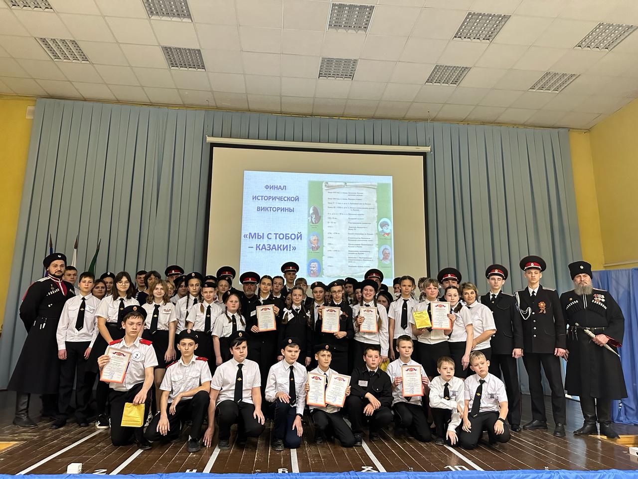 Финал районной исторической викторины «Мы с тобой – казаки!» среди обучающихся 6 – 8 классов казачьей направленности общеобразовательных организаций района прошёл 1 марта 2024 года на базе школы № 38, который организовали отдел казачества и народных традиций Дома детского творчества совместно с Абинским муниципальным отделением Союза казачьей молодежи Кубани. Всего в полуфинале приняли участие около 100 обучающихся из 24 школ района. На мероприятии присутствовали почетные гости: Первый помощник атамана Абинского районного казачьего общества Александр Владимирович Булавин, настоятель Храма благоверного великого князя Александра Невского протоиерей Виктор Щавинский, атаманы хуторских казачьих обществ. В финале встретились команды школ: № 6, 14, 15, 17, 32, 39, 43 — победители и призеры отборочного этапа. Участники состязались в 4 раундах: «Исторический диктант», «Цена вопроса», «Конкурс капитанов», «Казачья скрыня». Вопросы охватывали многие стороны жизнедеятельности кубанского казачества. Победителями стали: команда МКОУ ООШ № 39 ст. Эриванской ; второе место – команда школы № 32 х. Ольгинского; третье место – команда школы № 17 ст.Холмской.