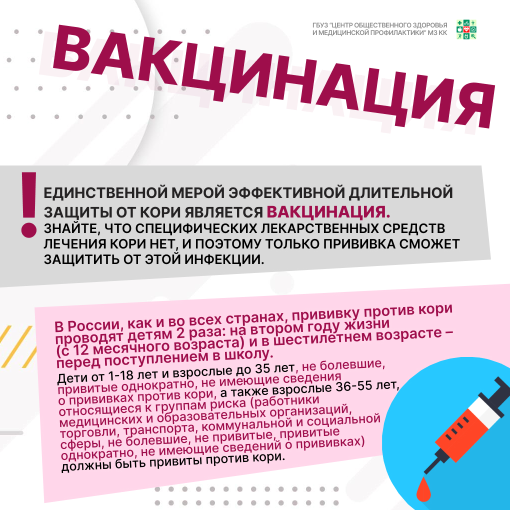 Как же защититься от этой инфекции? Важнейшим условием ликвидации кори является достижение высокого уровня охвата профилактическими прививками. В России прививки против кори проводят детям в 12 месяцев, затем – в шестилетнем возрасте. Кроме того, прививкам подлежат все лица в возрасте до 35 лет, не привитые ранее или имеющие только одну прививку против кори.