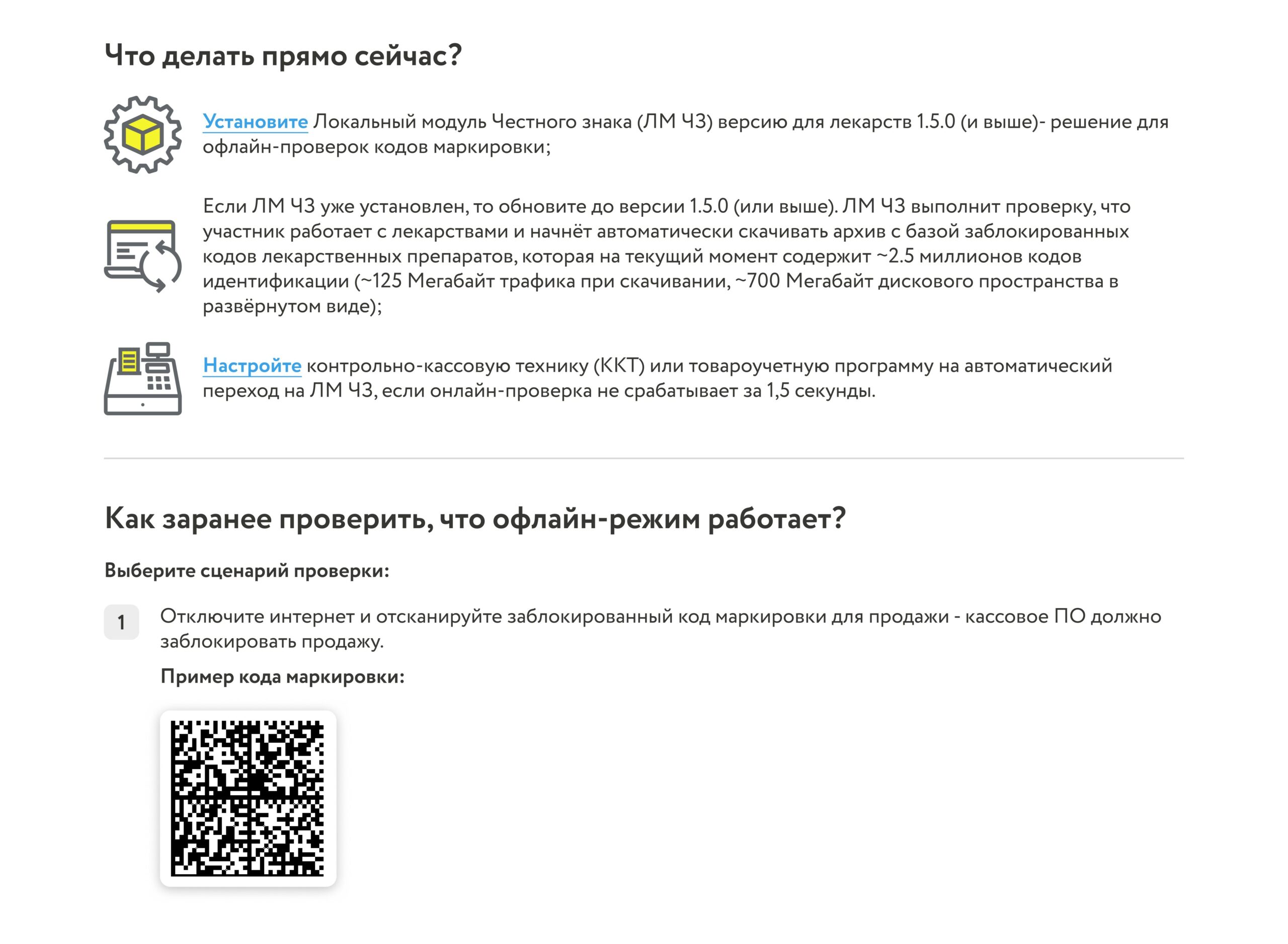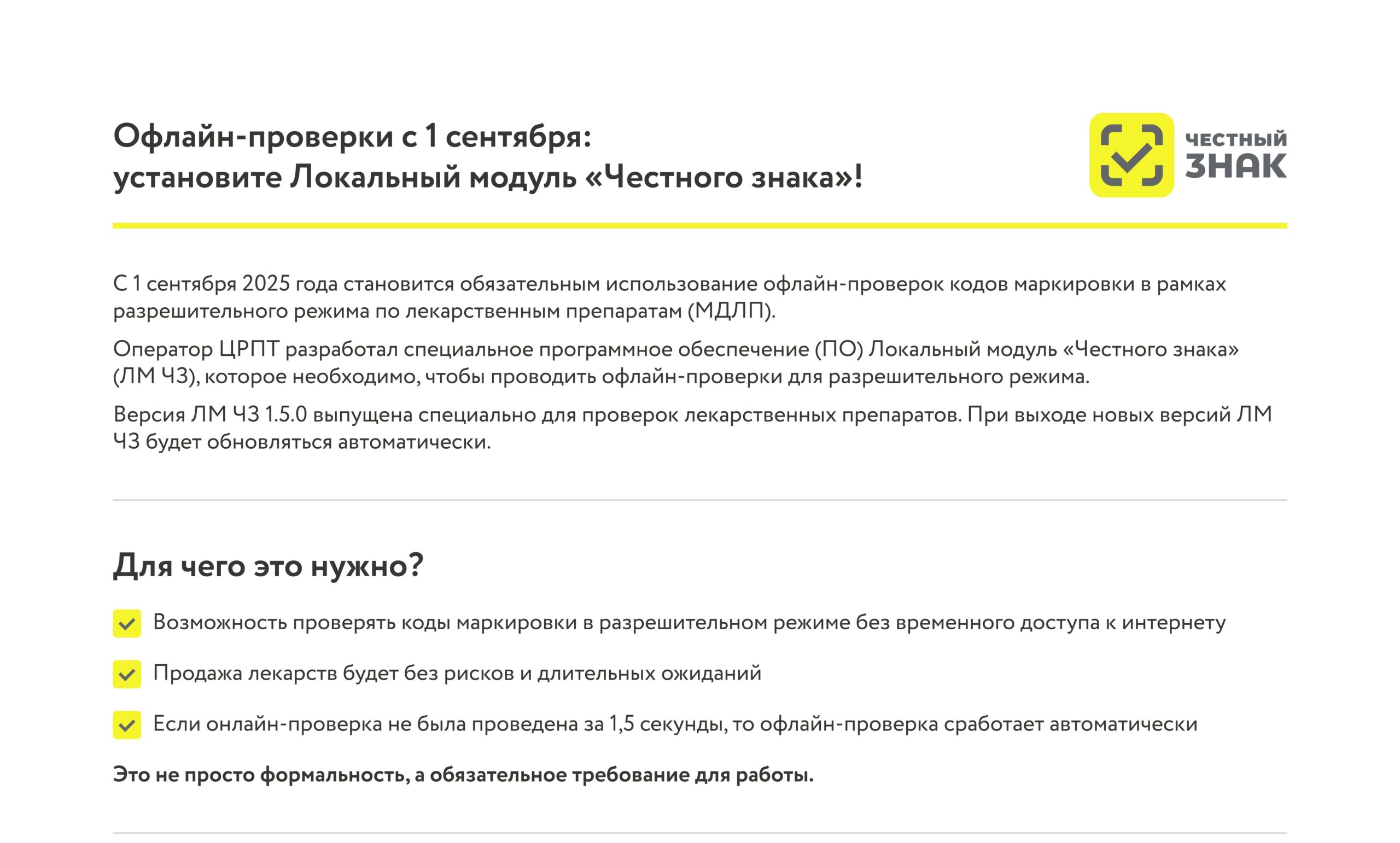 С 1 июня 2025 г. на территории Российской Федерации введен механизм онлайн-проверок продаж лекарственных препаратов для медицинского применения субъектами обращения лекарственных средств, осуществляющими розничную торговлю лекарственными препаратами, на основании информации, полученной из системы мониторинга движения лекарственных препаратов для медицинского применения. А с 1 сентября 2025 г. становится обязательным использование офлайн-проверок кодов маркировки в рамках разрешительного режима по лекарственным препаратам для медицинского применения. Вопросы, возникающие в связи с подготовкой к соблюдению обязательных требований, можно направлять на адрес электронной почты:support@crpt.ru».