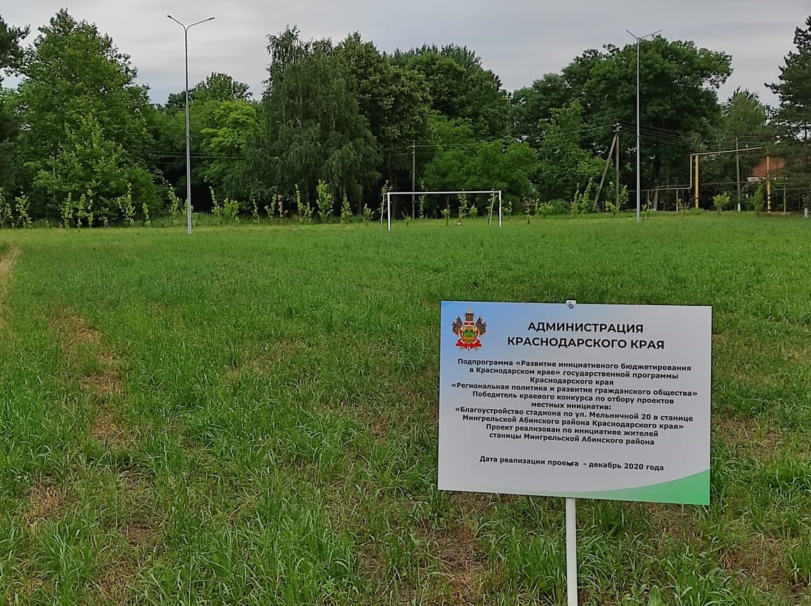 Мингрельское сельское поселение – благоустройство стадиона по ул. Мельничной 20 в станице Мингрельской Абинского района, Краснодарского края на сумму 1 136,182 тыс. рублей.